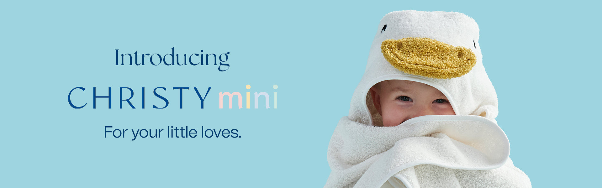 Introducing our softest, safest, and cutest collection to date, Christy Mini. Wrap your little ones up in a snuggly embrace and browse our range of children’s products. Designed to bring comfort and joy to your everyday routine, bathtimes and bedtimes have never felt so easy.